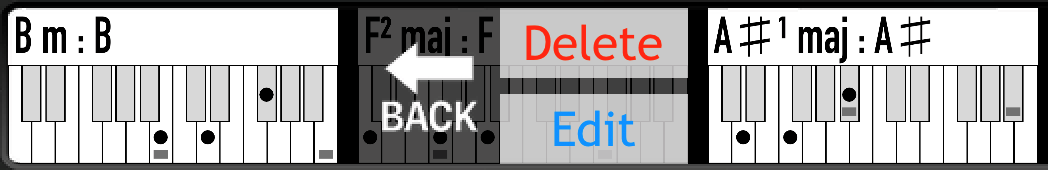 Wenn auf EDIT getippt wird, dann werden alle Noten des Akkords auf den beiden Tastaturen angezeigt und können entsprechend korrigiert werden. Wird danach auf DONE getippt, werden die Änderungen übernommen oder mit BACK wird abgebrochen.